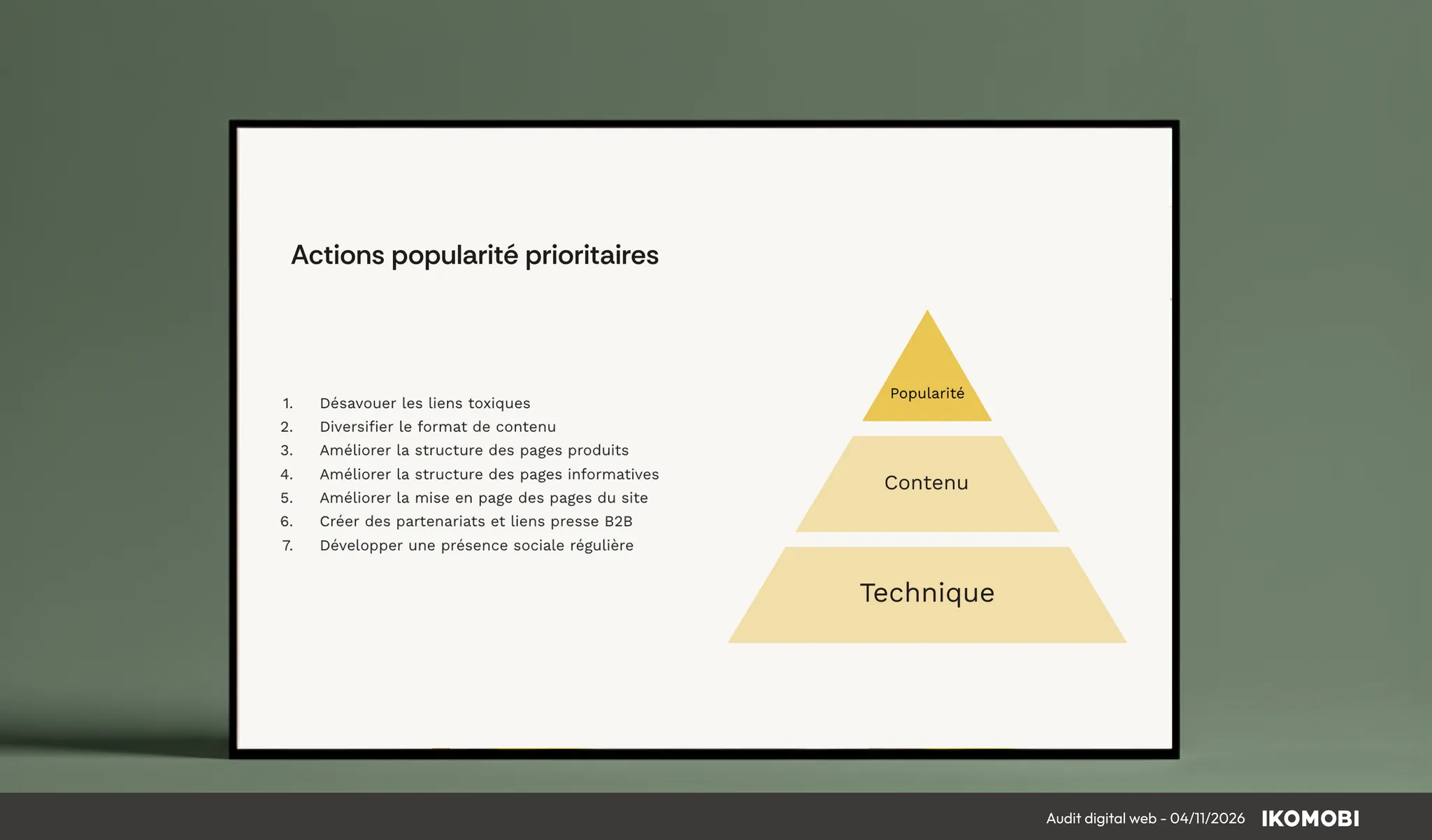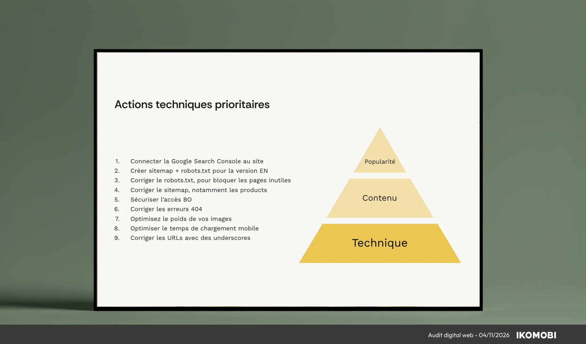 Présentation du rapport d’audit complet et consolidation des analyses techniques, sémantiques, concurrentielles et UX.