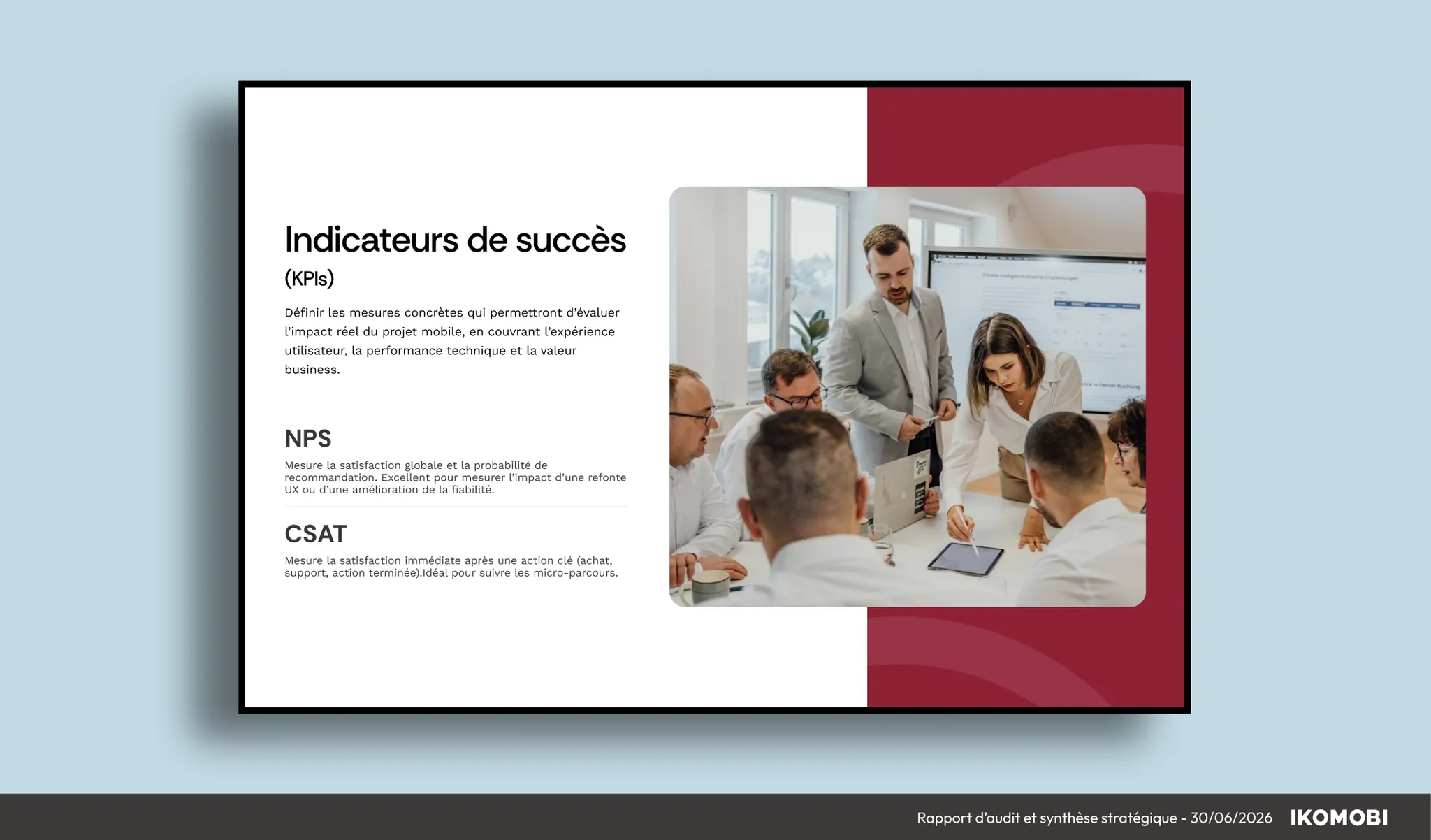 Le Pack GO/NO GO d’Ikomobi permet de mesurer son potentiel réel à travers une approche 360° : stratégique, financière et qualitative. Nos experts analysent le rôle de l’app dans votre stratégie globale, estiment les coûts (initiaux et récurrents), identifient les fonctionnalités clés à forte valeur ajoutée et mesurent le ROI prévisionnel.